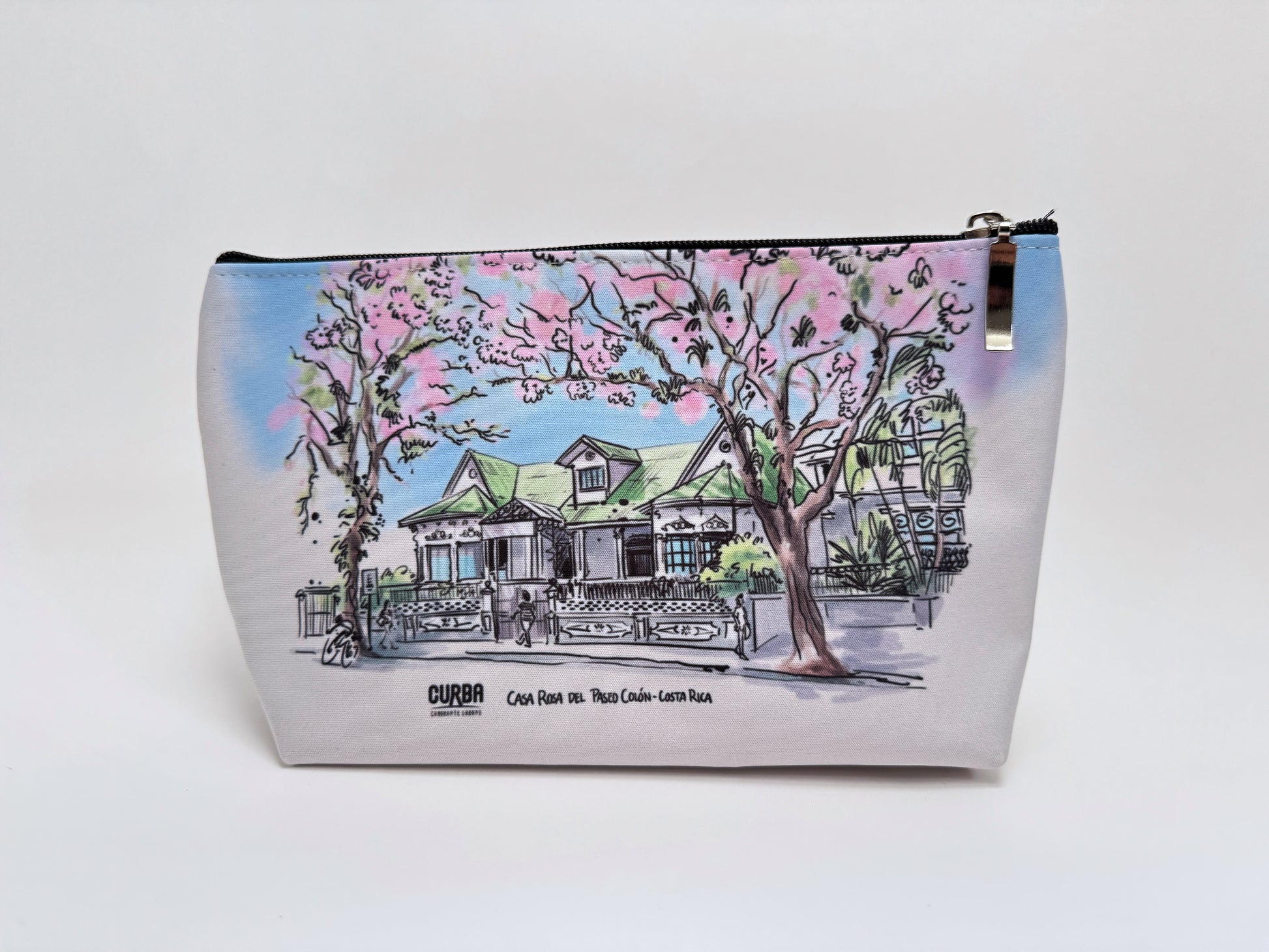Cosmetiquera de tela tipo Cordura con el diseño de la Casa Rosa en Paseo Colón, sublimado por ambos lados.